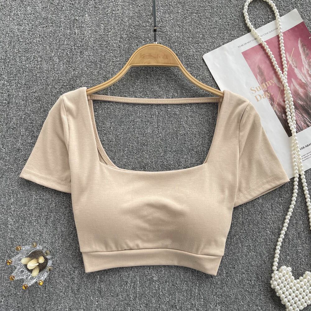 insスーパーホットスクエアカラー露出鎖骨半袖Tシャツ女子夏韓国版自家栽培気質オールマッチショートおへそトップトレンディ サマー 夏物 スクウェア lyxaj35773262440