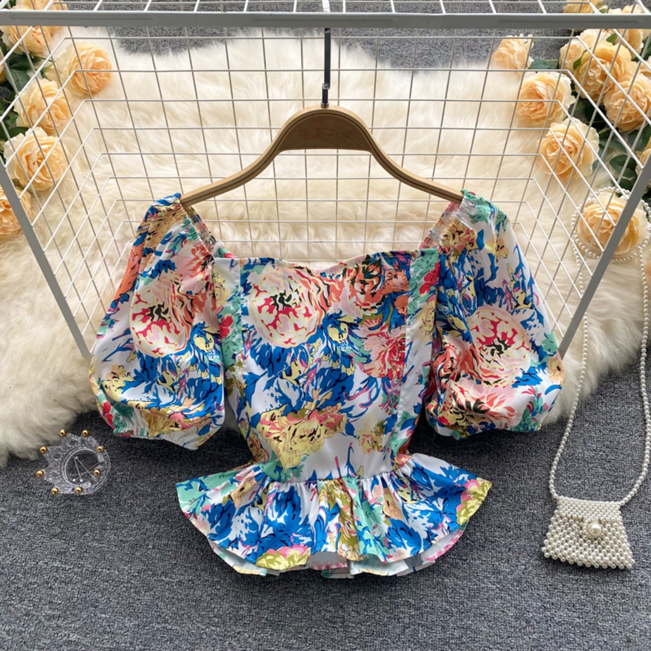 ホリデースタイルのプリントパフスリーブフローラルシャツレディースウエスタンスタイルのスクエアカラーウエストは細くて短いホットな女の子の背中の開いたトップトレンディです ショート 花柄 スクウェア lyxaj64131215711