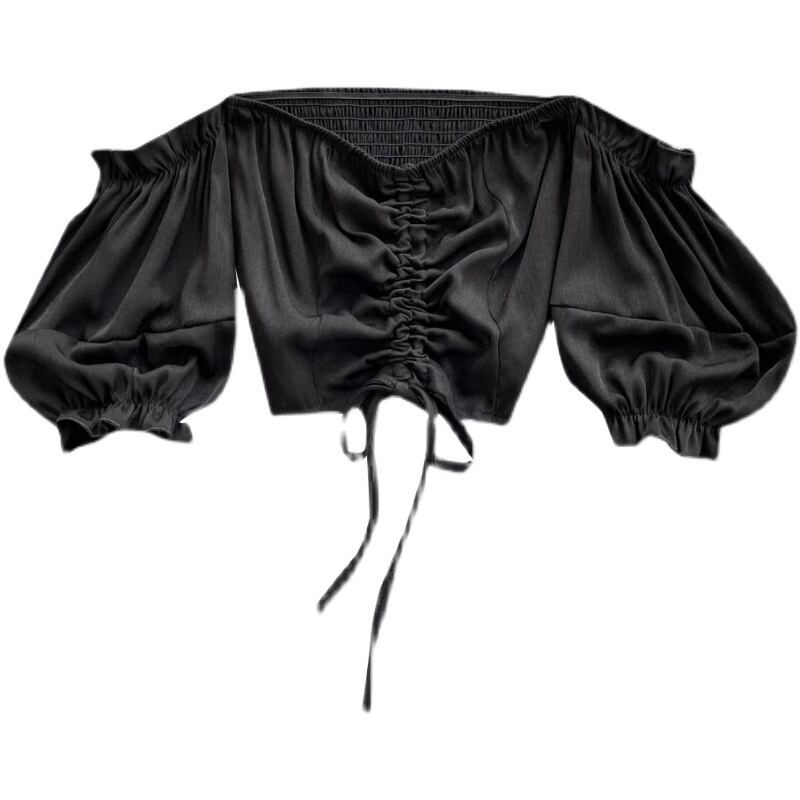 Summer fashion one-shoulder pleated drawstring puff-sleeved shirt women's Western chic short cropped belly button sweet and spicy top ショート 大人ガーリー スウィート キュート カジュアル プリーツ サマー 夏物 lyxaj49991381028