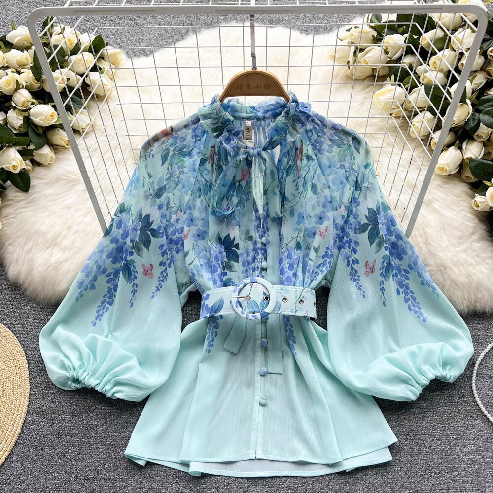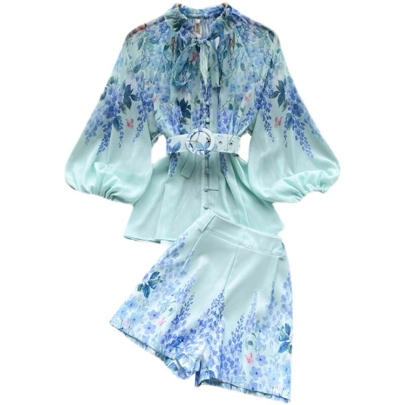 フレンチハイエンドプリントスーツレディースサマー薄着ランタンスリーブレースウエストシャツショーツファッショナブルなツーピースセット 夏物 ブルマー lyxaj25342359546