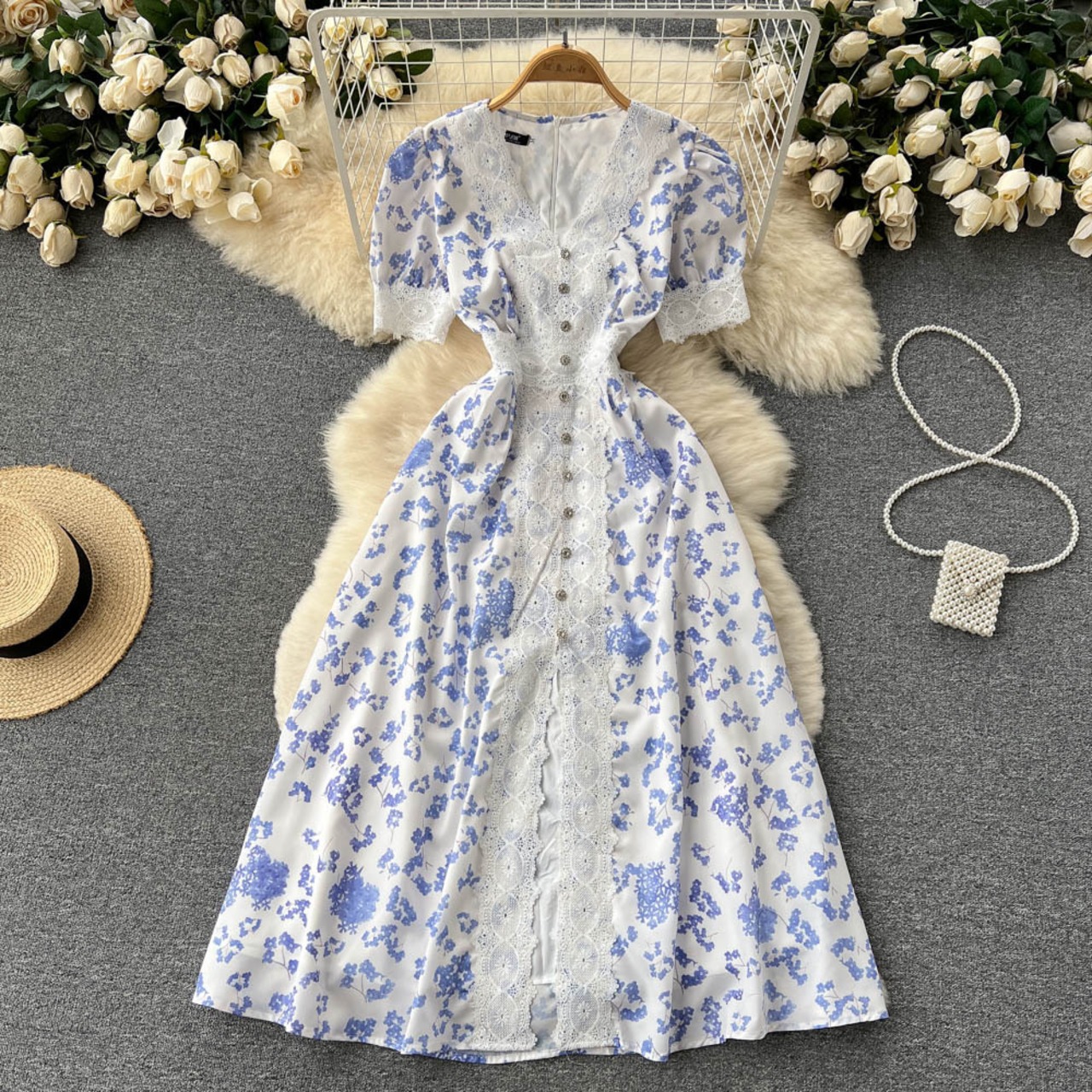 フレンチジェントルスタイルフローラルハイウエストスリムドレスステッチレースハイエンド気質パフスリーブスウィートAラインスカート ハイウェスト 大人ガーリー キュート カジュアル 花柄 lyxaj71575408332