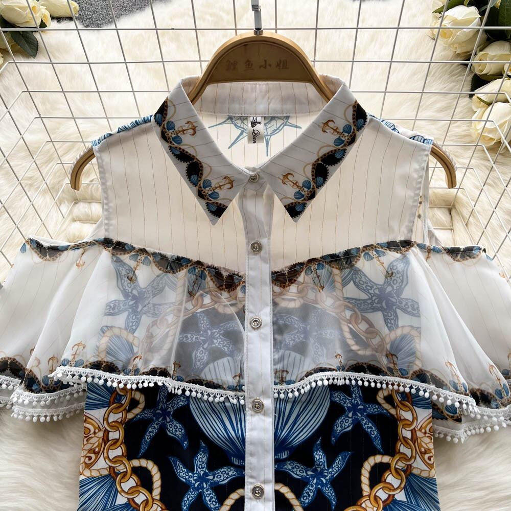 Sweet and fashionable suit single-breasted ruffled mesh stitching off-the-shoulder top high-waisted wide-leg shorts two-piece women's 大人ガーリー スウィート キュート カジュアル メッシュ ショーツ ブルマー ステッチ lyxaj91003250343