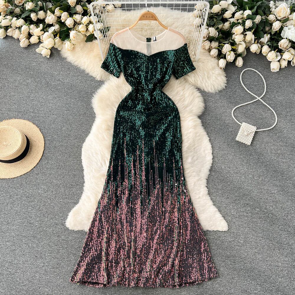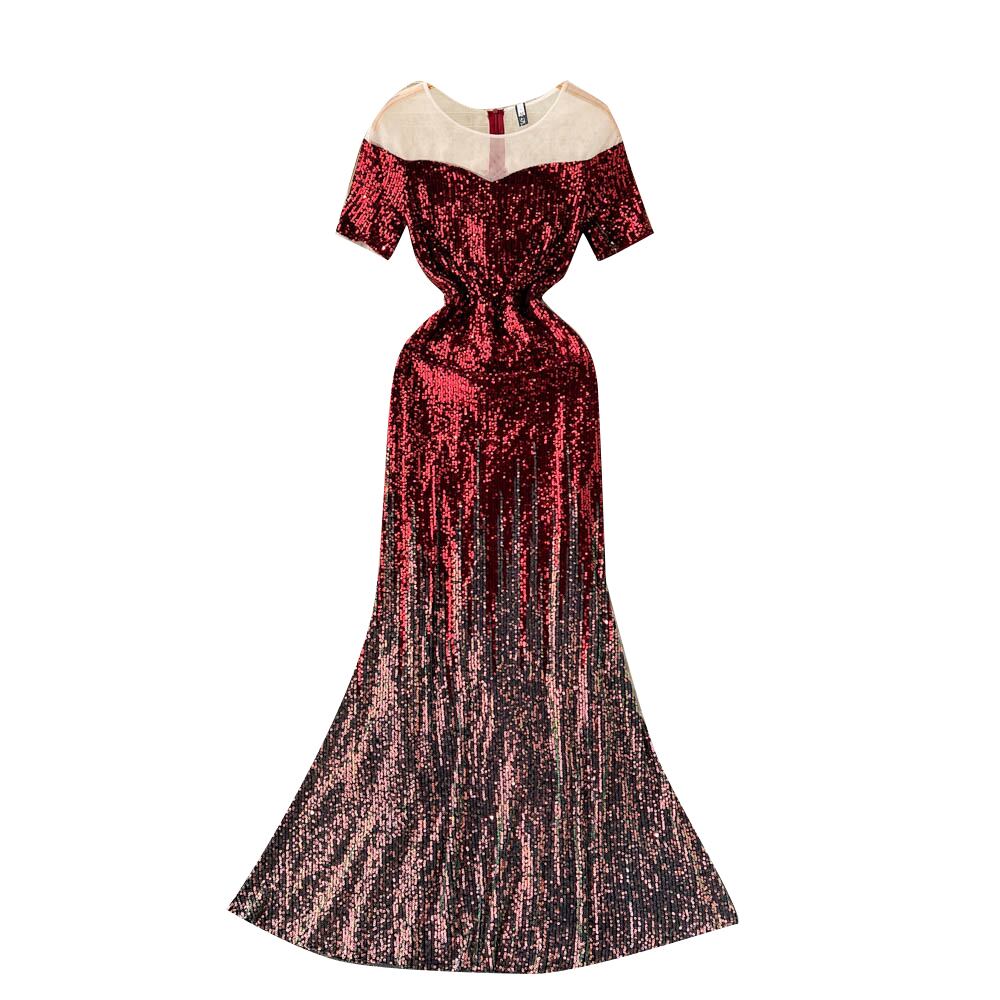Retro evening dress skirt temperament short-sleeved waist slim fishtail dress female gradient color unique mesh long skirt ロング レトロ メッシュ スカート スリム lyxaj50564062350