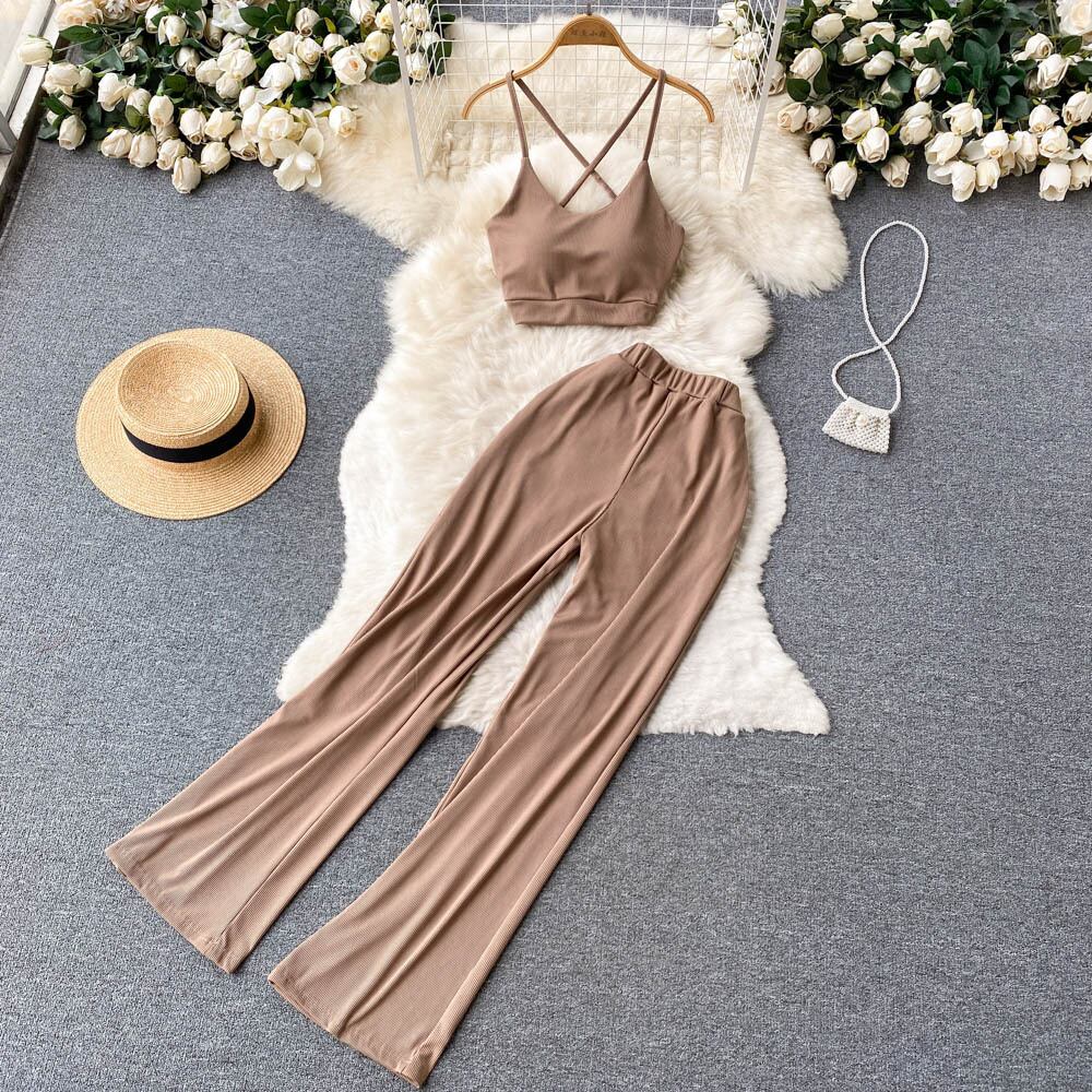 Summer fashionable suit women's cross sling cropped navel short vest top high waist drape casual trousers two-piece set ハイウェスト ショート カジュアル サマー 夏物 lyxaj30213696822