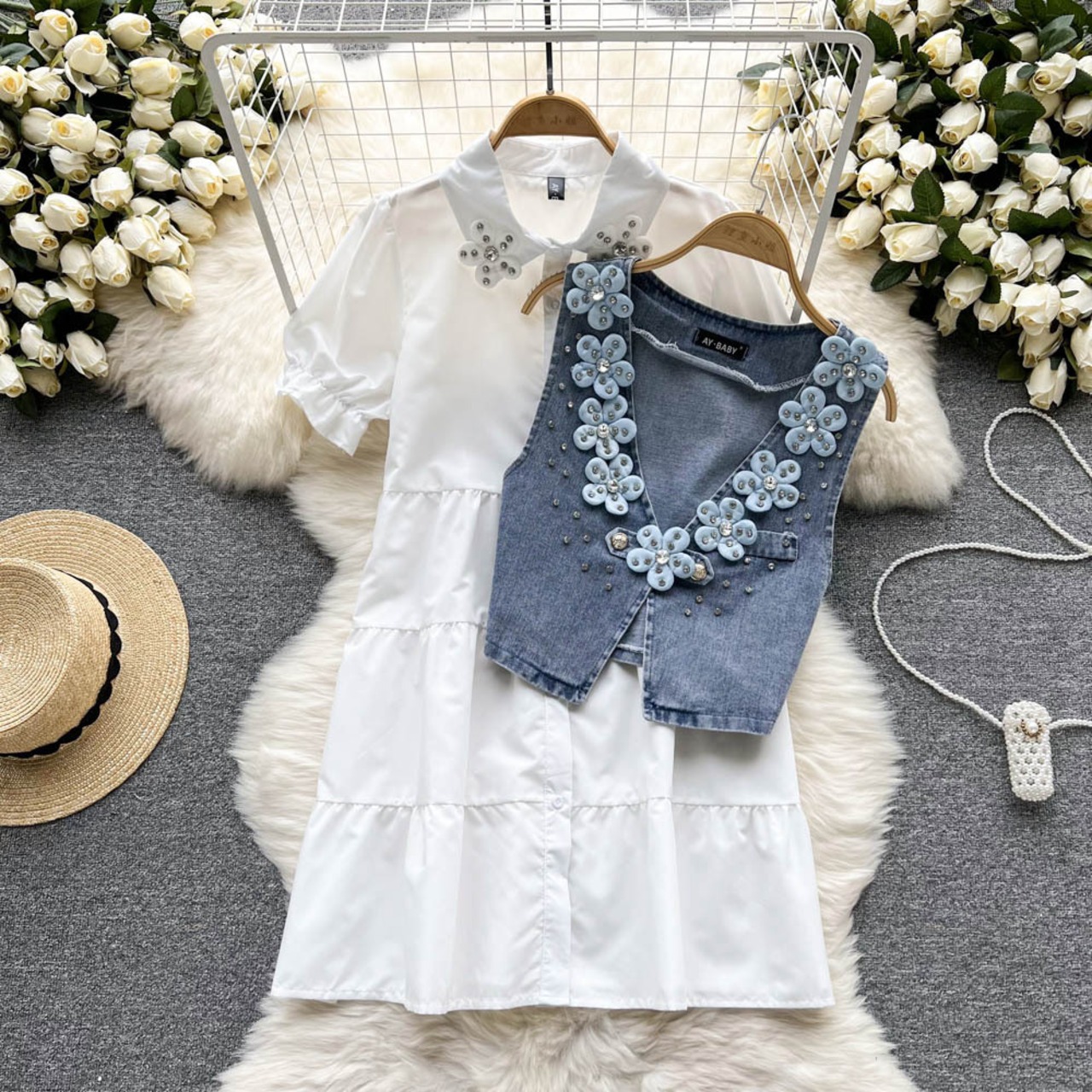 バイタリティガール韓国風パフスリーブシングルブレストaラインシャツワンピース+デニムベスト立体フラワースーツタイド フラワーデザイン lyxaj77266251029