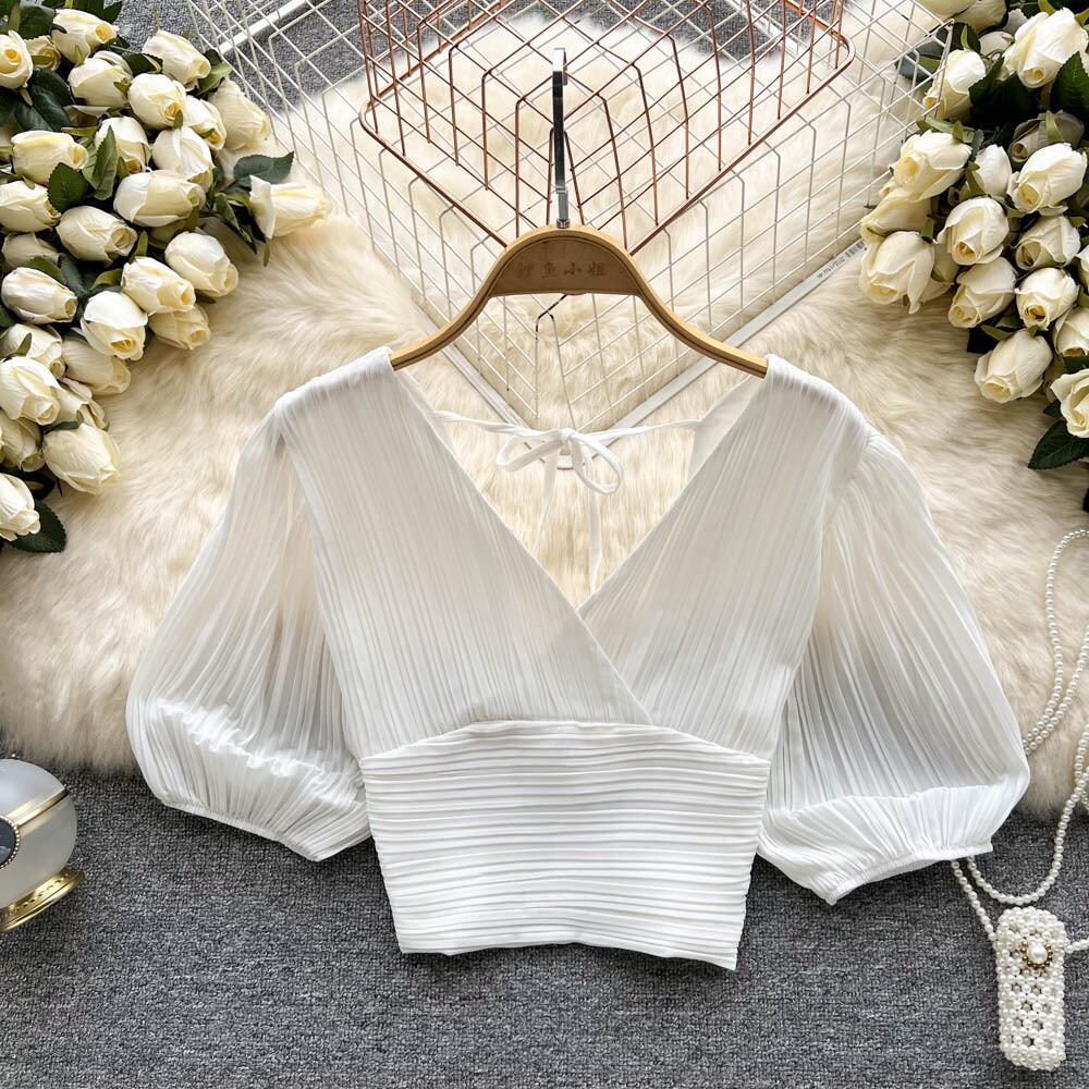 シックな風の妖精甘くてスリムなスリムなパフスリーブシャツセクシーなVネックショート気質オールマッチシフォントップ 大人ガーリー スウィート キュート カジュアル lyxaj64448399483