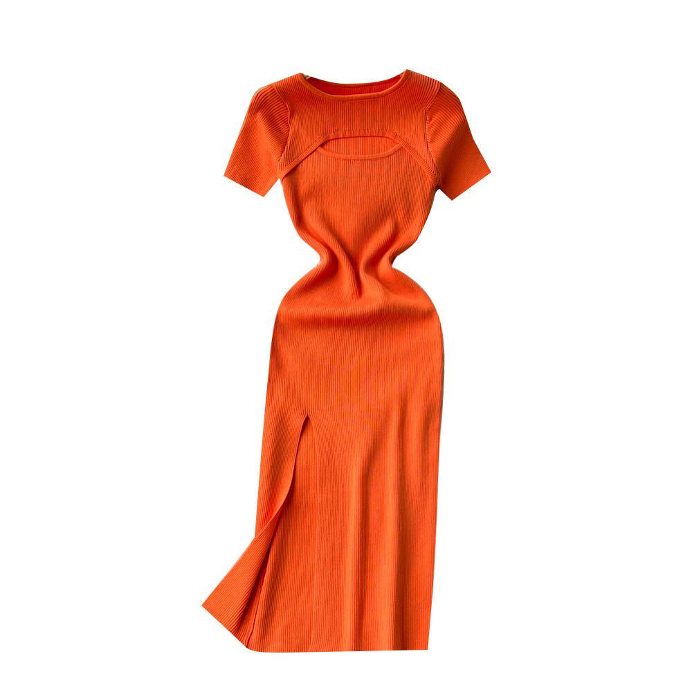 French gentle wind heart machine hollow round neck short-sleeved dress women's slim fit and thin temperament slit bag hip midi skirt スカート Oネック スリム lyxaj5309416639