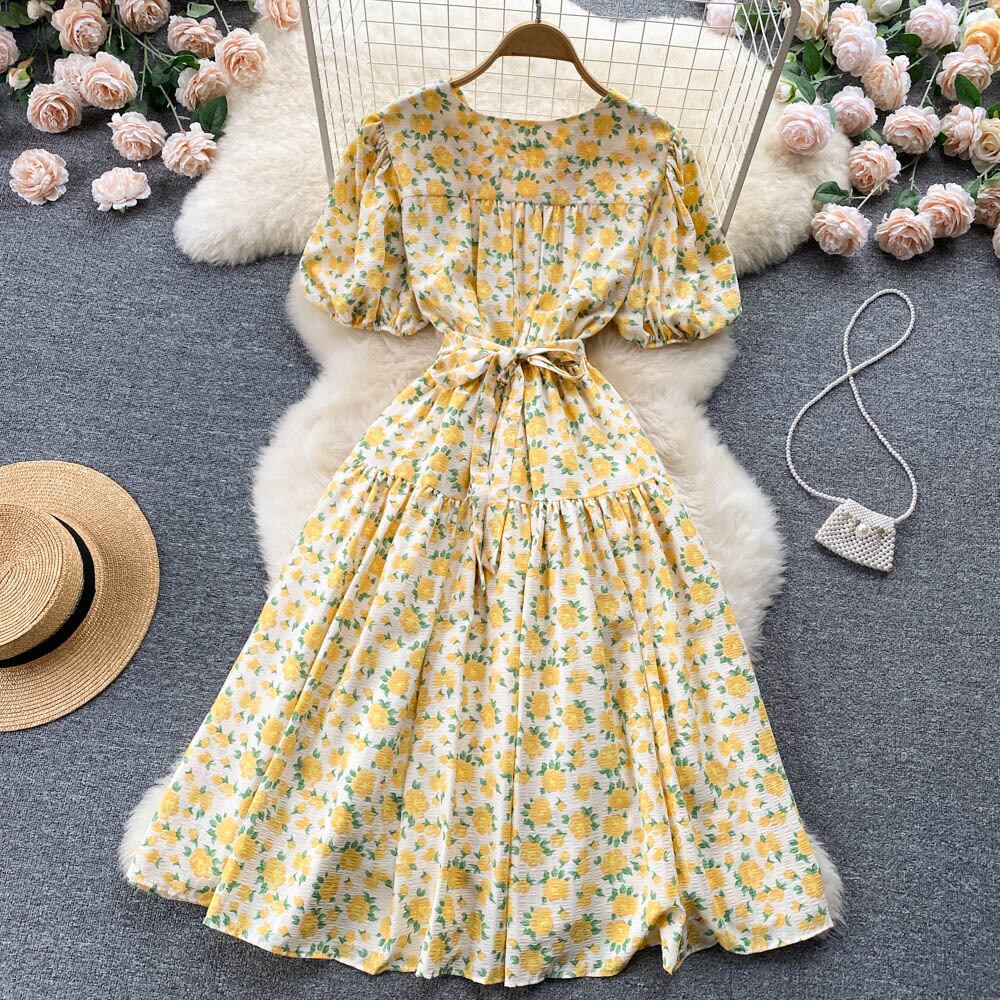 Gentle wind French first love V-neck puff sleeve dress female waist-reducing fairy skirt sweet temperament A-line skirt 大人ガーリー スウィート キュート カジュアル スカート Vネック Aライン lyxaj51322478876