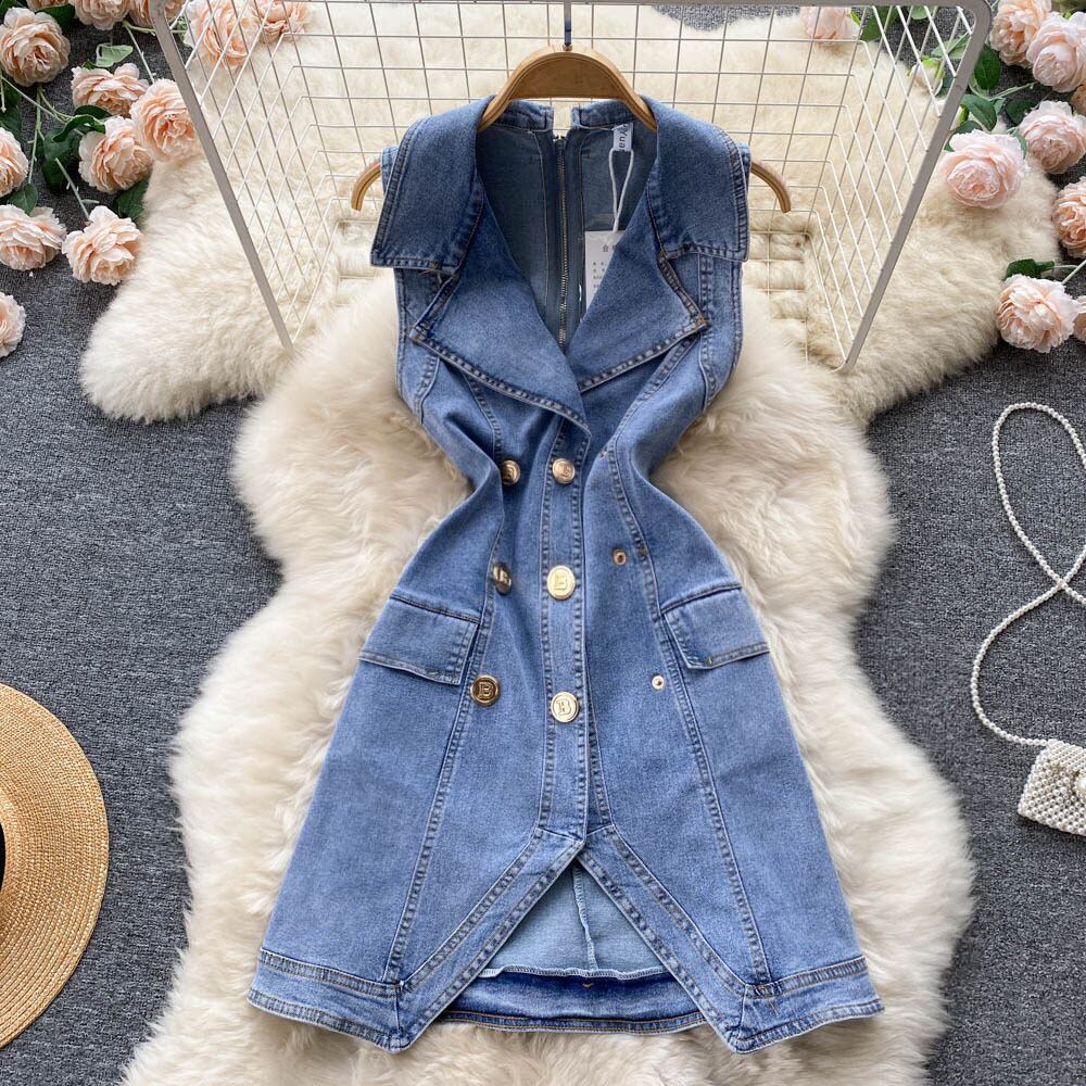 Retro lapel denim dress women's summer 2022 new version of the small waist is thin sleeveless short skirt ショート レトロ サマー 夏物 ノースリーブ スカート lyxaj59457305253