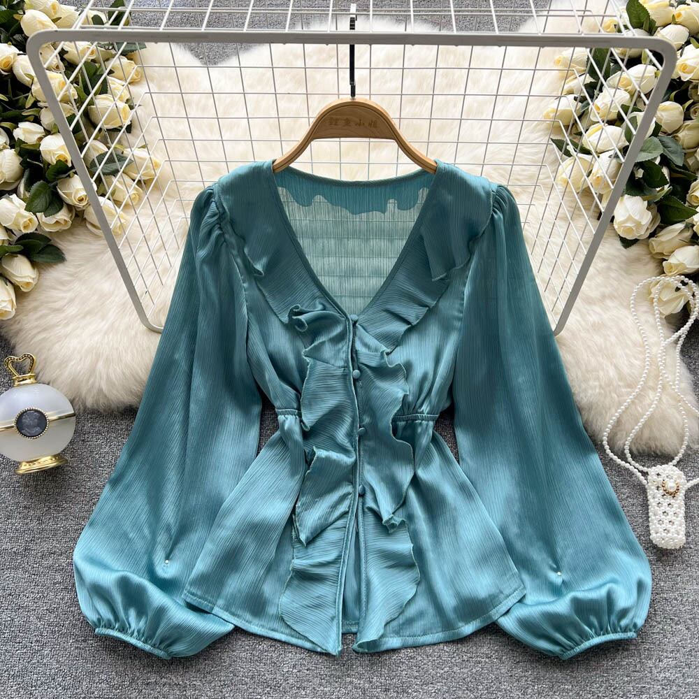 Spring's new chic fungus edge V-neck design is unique and unique, pure desire to shrink the waist and show thin tops bottoming shirts trend シャツ スプリング 春物 Vネック ピュア lyxaj73531117539