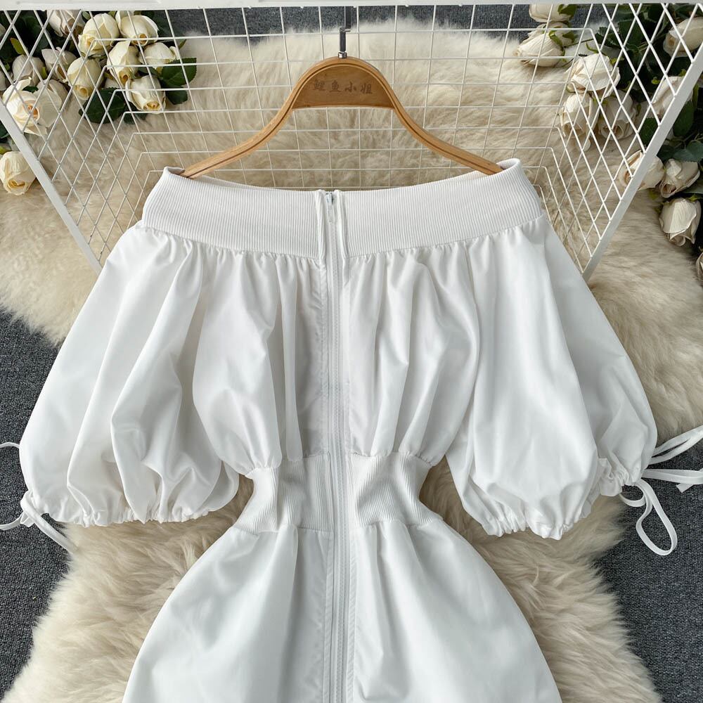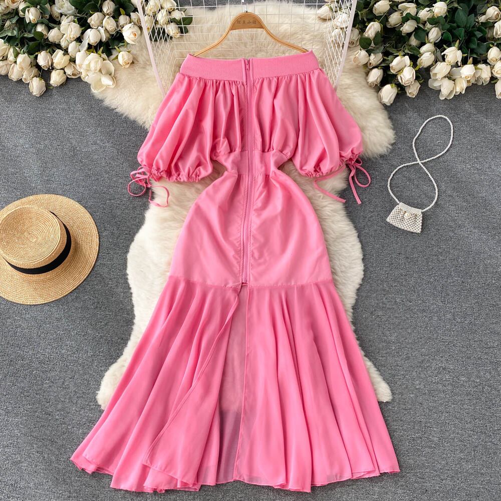 フレンチニッチデザインセンスワンワードネックジッパーパフスリーブワンピースハイウエストスリムステッチシフォンスリットロングスカート ハイウェスト lyxaj85192614432