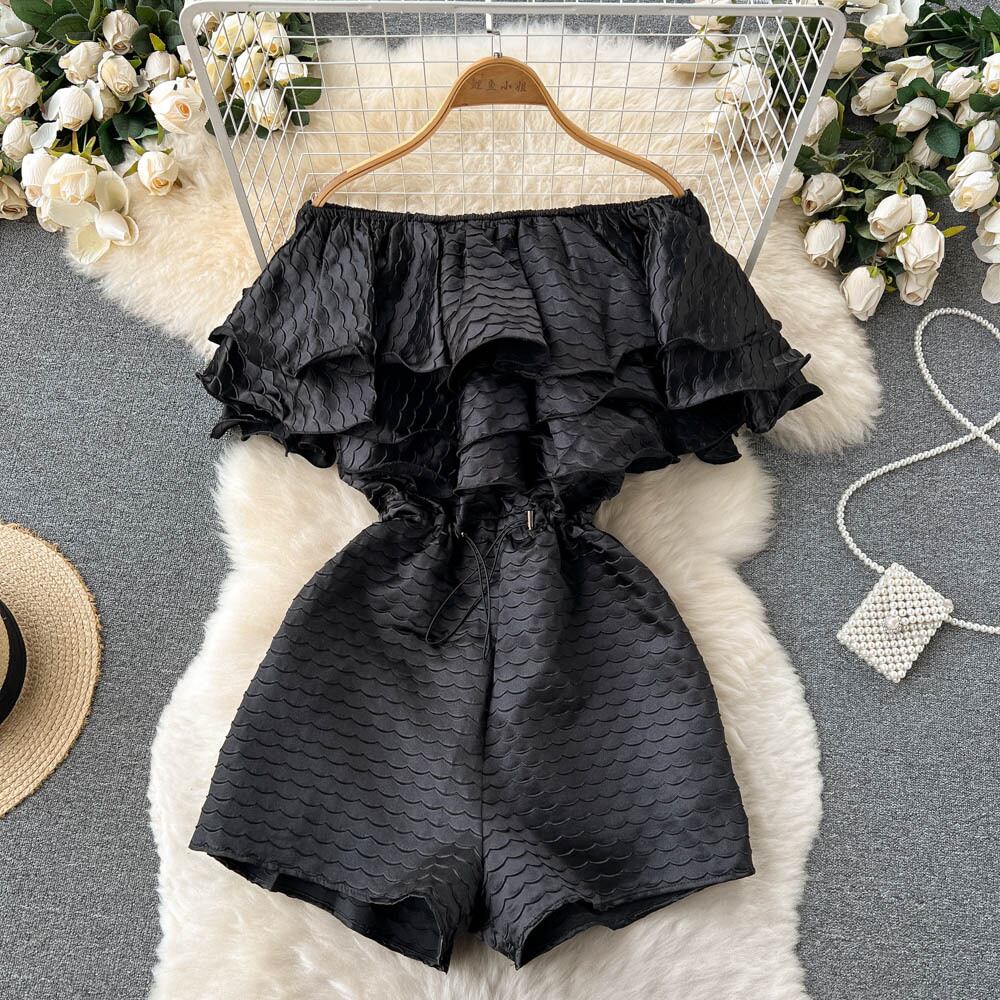 ホリデースタイルのスモールフレッシュロータスリーフワンワードネックオフショルダージャンプスーツレディースサマードローストリングウエストオールマッチワイドレッグショーツ 夏物 ブルマー lyxaj35284576212