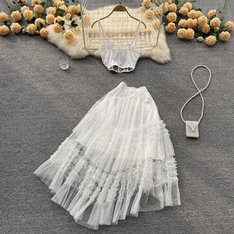 Temperament fried street suit camisole vest short top high waist irregular mesh skirt two-piece set ハイウェスト ショート ストリート メッシュ スカート lyxaj77632357390