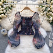 French super fairy mesh stitching long-sleeved temperament printing shirt women's summer pleated slim fit and thin short top trendy ショート ロング プリーツ サマー 夏物 メッシュ スリム ステッチ lyxaj31416721906