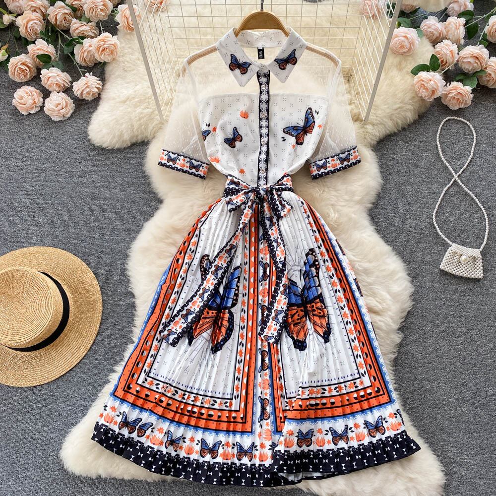 Summer new doll collar European and American style A-line skirt women's butterfly print waist pleated lapel shirt dress プリーツ サマー 夏物 スカート Aライン ヨーロピアン lyxaj12585008854