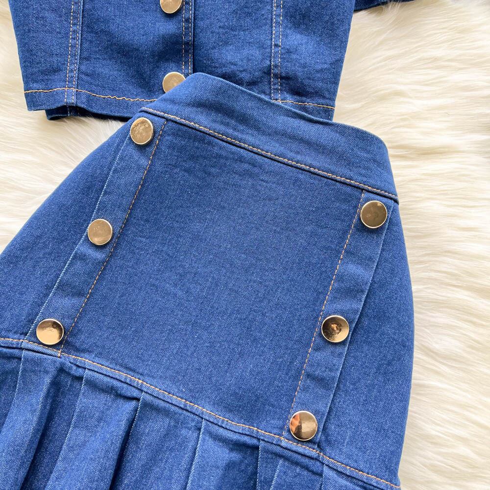Hong Kong style retro western style age-reducing denim top suit women's summer new high waist pleated skirt two-piece tide ハイウェスト レトロ プリーツ サマー 夏物 スカート lyxaj42422593368