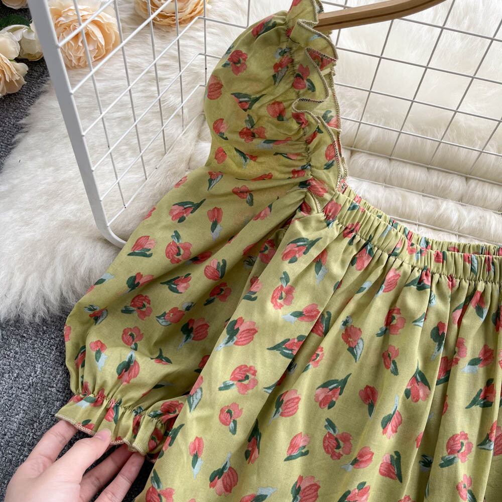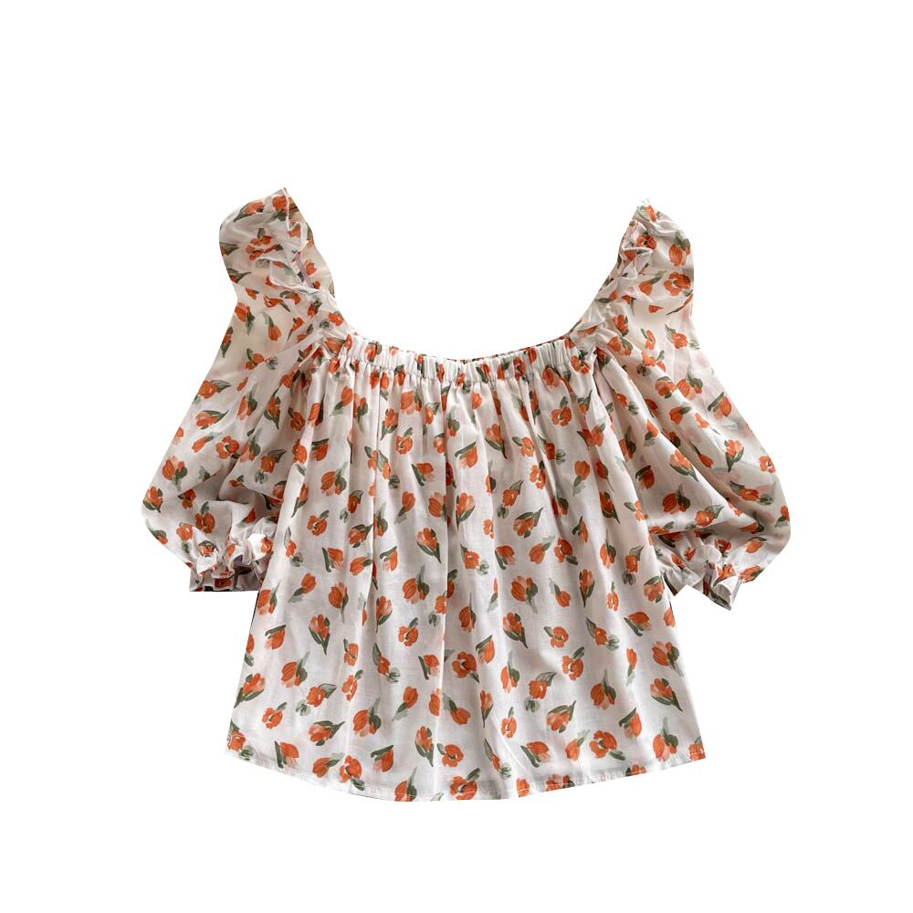 Summer new loose and thin printed bubble short-sleeved square collar one-shoulder floral top women's niche French shirt プリント サマー 夏物 花柄 スクウェア lyxaj80818091777