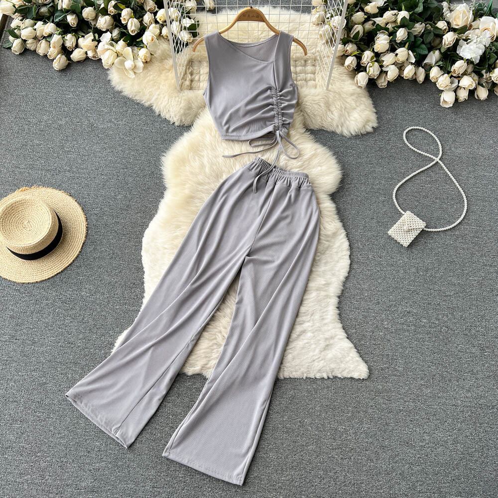 Summer fashionable suit feminine sleeveless hollow drawstring pleated top high waist drape wide leg pants two-piece trendy ハイウェスト プリーツ サマー 夏物 ノースリーブ ワイドレッグ ワイドパンツ lyxaj6260700367