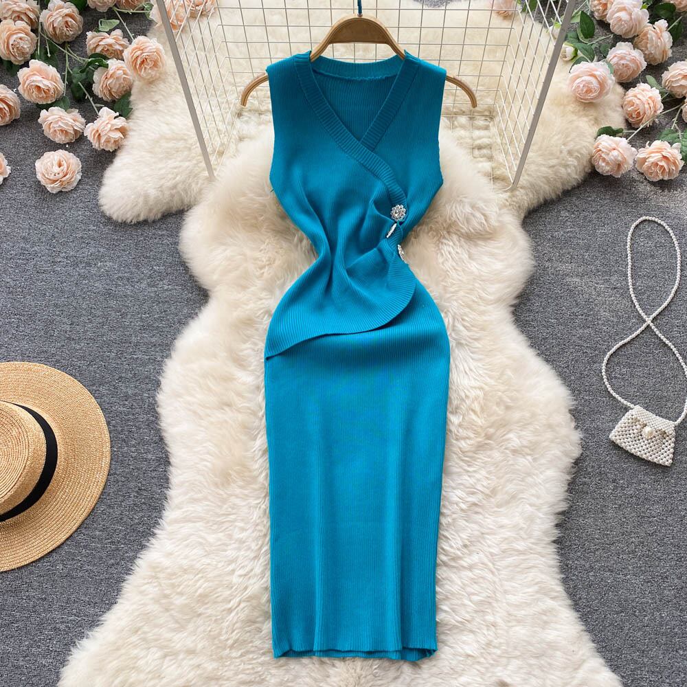 Chic wind fairy sweet, slim and slim V-neck sleeveless knitted dress 2022 summer new tight-fitting hip skirt 大人ガーリー スウィート キュート カジュアル サマー 夏物 ノースリーブ スカート Vネック スリム lyxaj13187027291