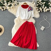 style fashion suit women's summer new round neck contrast color loose short-sleeved knitted sweater pleated skirt two-piece set プリーツ サマー 夏物 スカート Oネック lyxaj15953015020