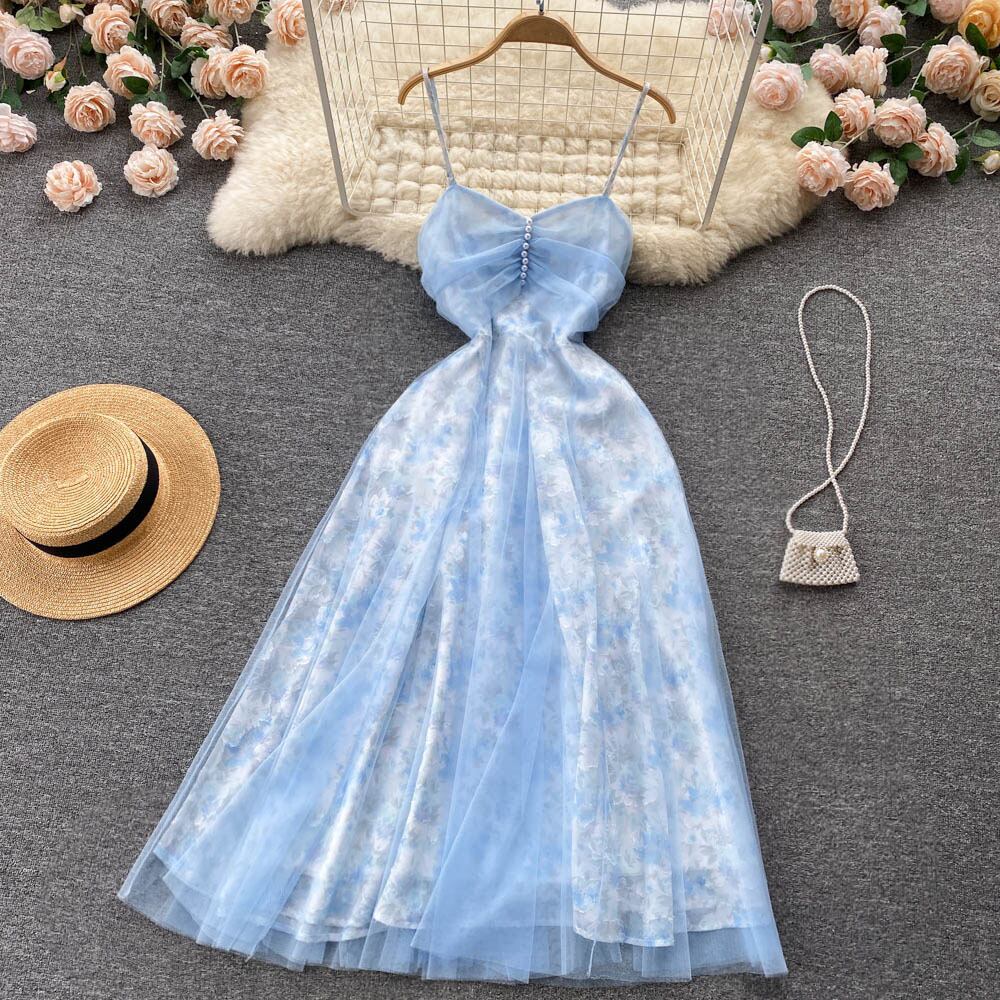 Waist-up mesh dress gentle wind summer new chiffon floral long skirt women's temperament niche suspender skirt ロング シフォン サマー 夏物 メッシュ 花柄 スカート lyxaj86654407490