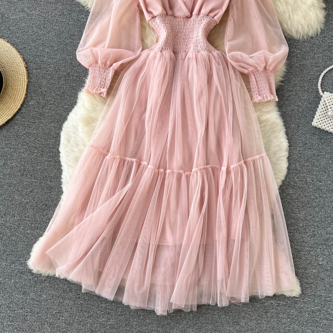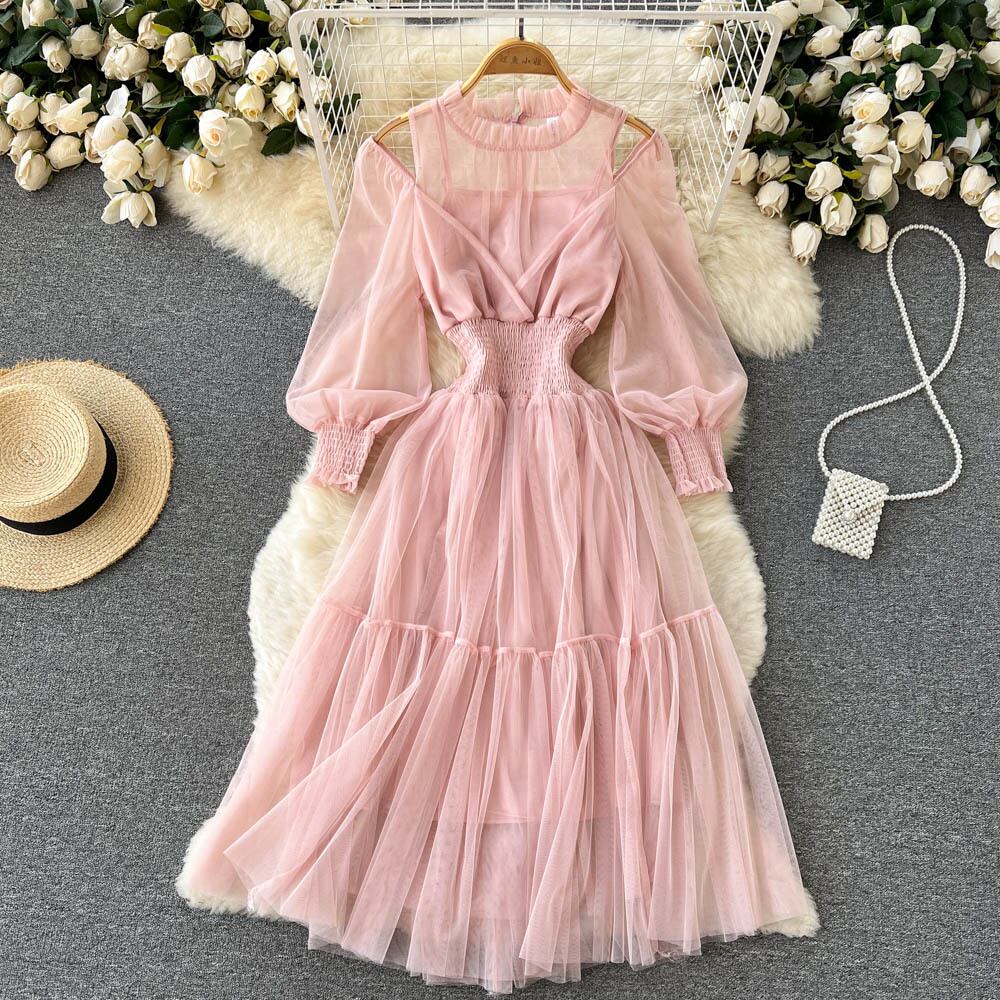 2022年の新しい春と夏のパフスリーブ菌のエッジの陰謀中空オフショルダーの妖精のスカート純粋な欲望のメッシュドレス スプリング 春物 サマー 夏物 ピュア lyxaj95562129788