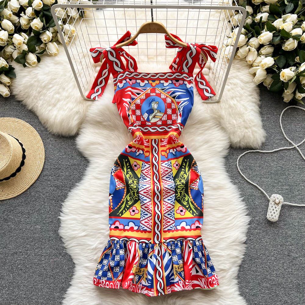 2022 summer temperament bow suspender skirt fashionable high waist unique personality print mid-length fishtail dress ハイウェスト リボン サマー 夏物 スカート lyxaj61984003316