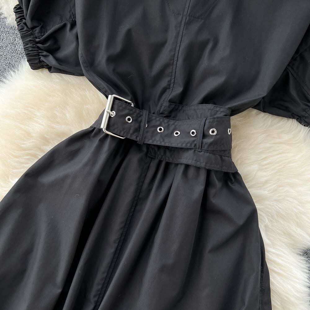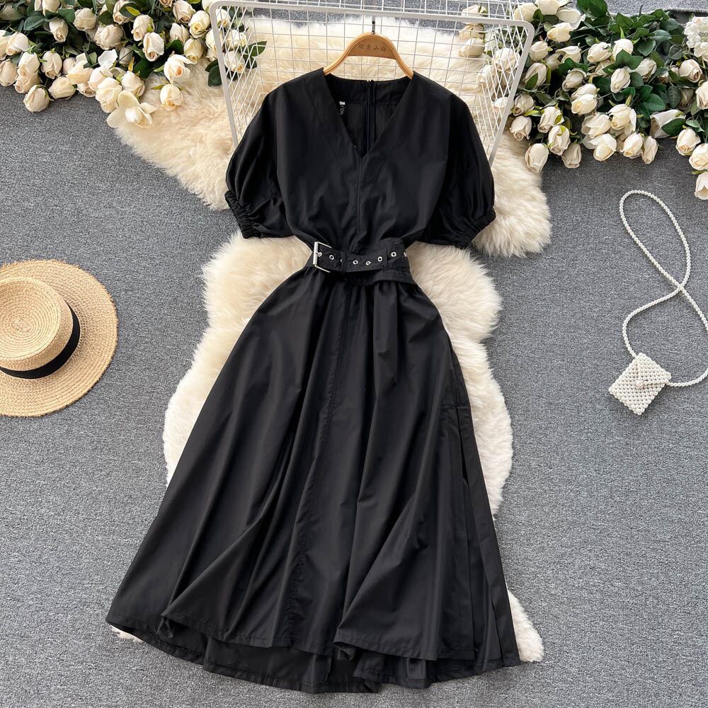 Summer 2022 Hepburn style fashion V-neck mid-length tie-up waist and slim temperament A-line dress short sleeves ショート 半袖 ハーフスリーブ サマー 夏物 Vネック Aライン スリム lyxaj4439478881