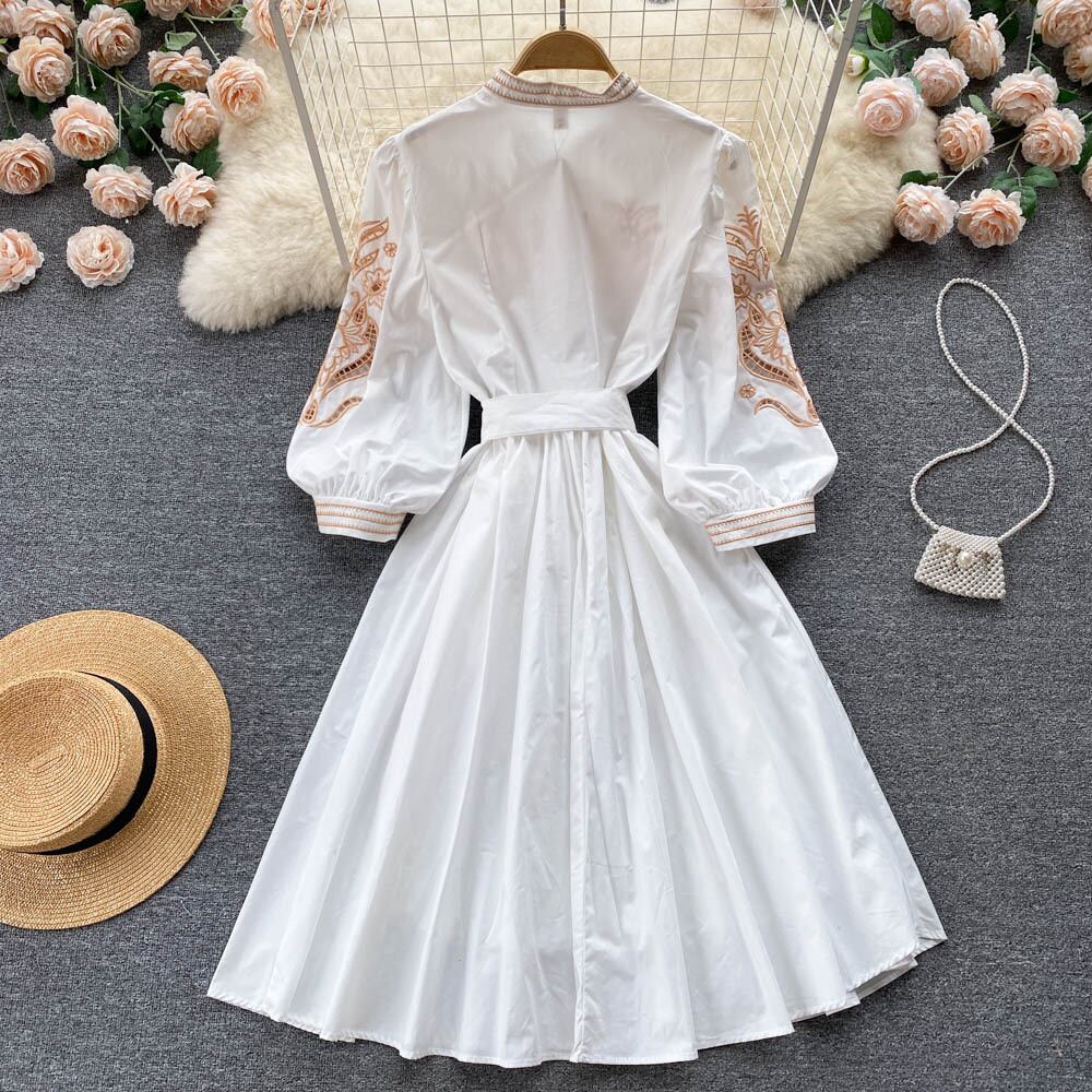 French light luxury high-end temperament heavy industry embroidered hollow stand-up collar long-sleeved dress women's lace waist A-line skirt ロング レッド レース 刺繍 スカート Aライン lyxaj54896867675