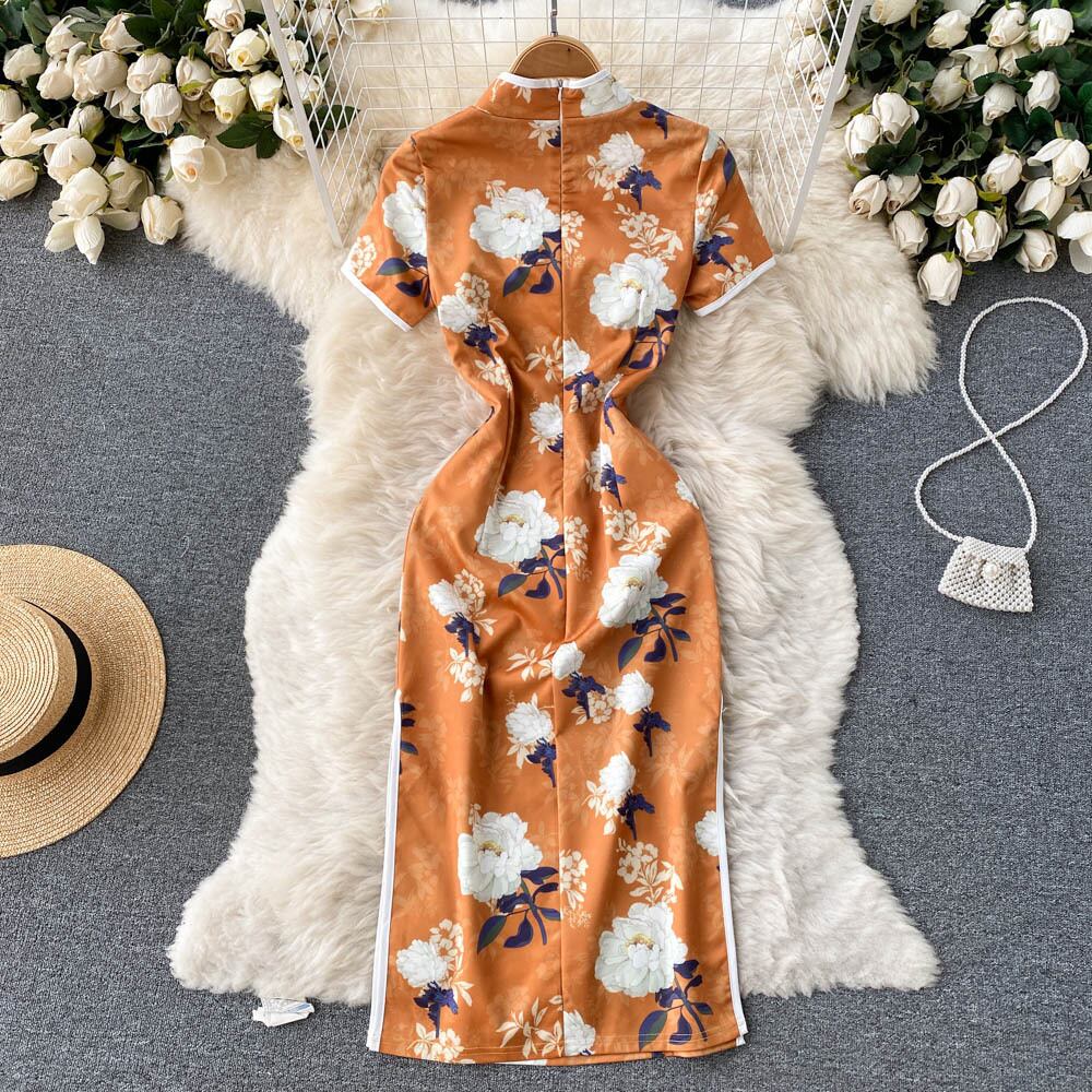 retro improved cheongsam young mid-length printed hip dress female sexy slit skirt レトロ プリント スカート lyxaj56820712314