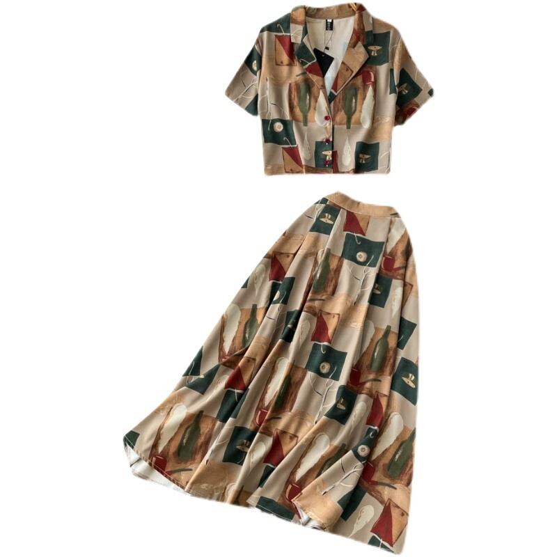Summer new Hong Kong style retro suit lapel short-sleeved button cardigan short shirt high waist skirt two-piece set ハイウェスト ショート レトロ カーディガン サマー 夏物 スカート lyxaj98277709259