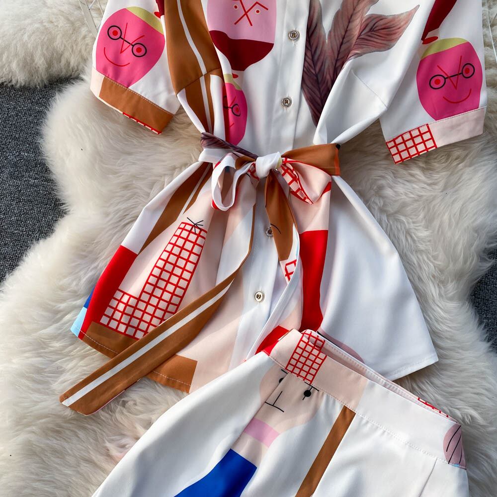Net Red Fried Street Suit 2022 Printed Shirt Women's Bandage Small Feet Pants Two-piece Set レッド プリント ストリート lyxaj45790028373
