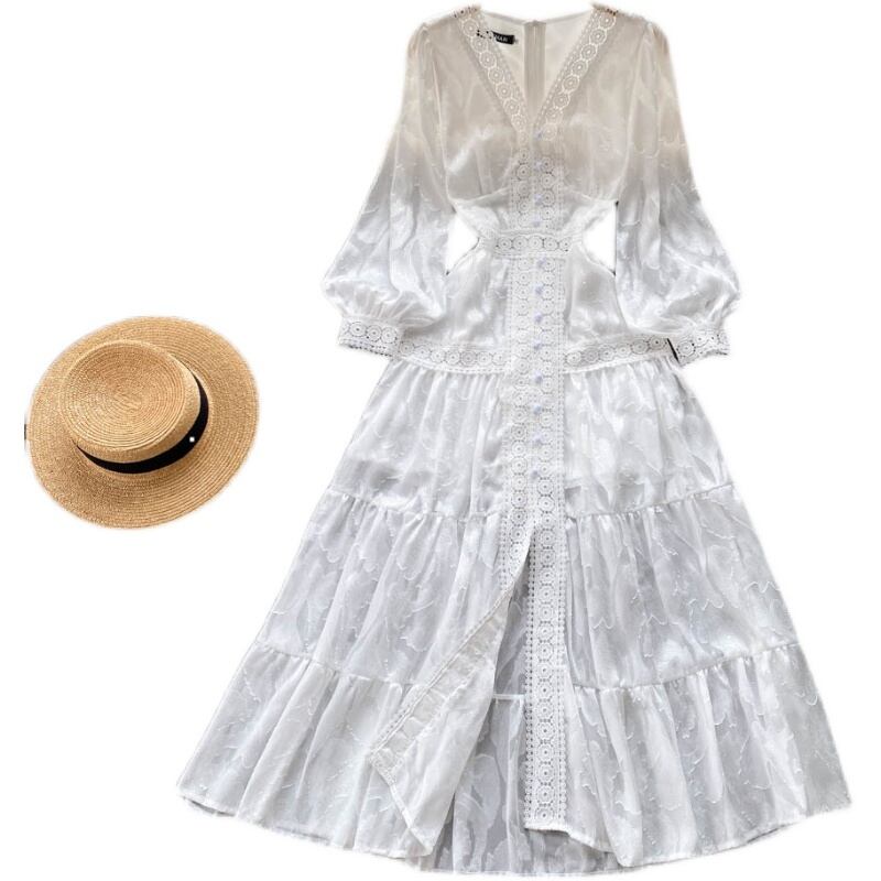 Celebrity temperament high-end lace lace V-neck white dress slim fit and slim bubble long-sleeved long skirt ロング ホワイト レース スカート Vネック スリム lyxaj5552501249