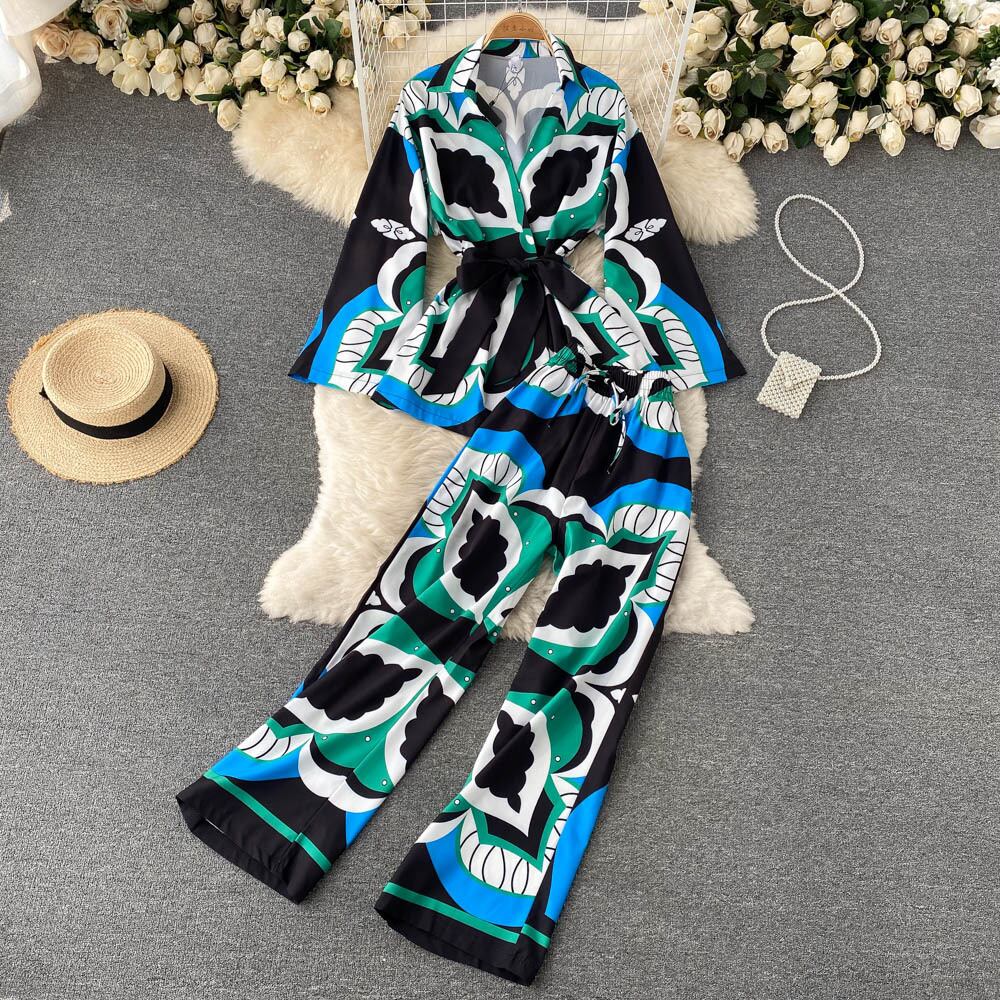 フレンチレトロプリントウエストネクタイワンピースワンピーススカートハイウエストワイドレッグパンツウエスタンスタイルエイジリダクションツーピーススーツ ハイウェスト ショート ワイドパンツ lyxaj76840787910