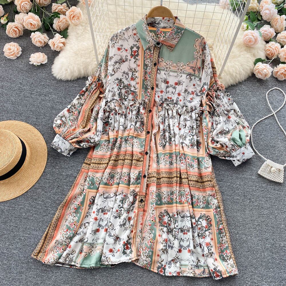 ヨーロッパとアメリカのインレトロプリントランタンスリーブシャツドレス女性の秋のルーズポロカラーシングルブレストラージスイングスカート オータム 秋物 ヨーロピアン lyxaj41334950524