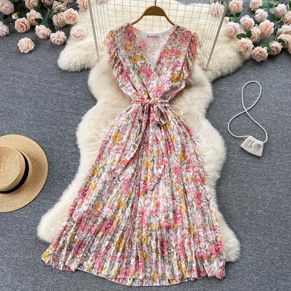 Printed deep V-neck waist-laced sexy pleated dress Literary Mori women sleeveless sweet temperament knee-length dress レース プリント 大人ガーリー スウィート キュート カジュアル プリーツ ノースリーブ Vネック lyxaj50141567180