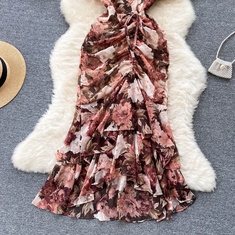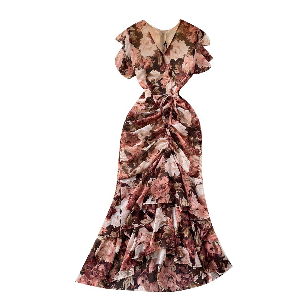 Temperament dress 2022 new women's scheming drawstring pleated slim mid-length ruffled print fishtail skirt プリーツ スカート スリム lyxaj16038994570