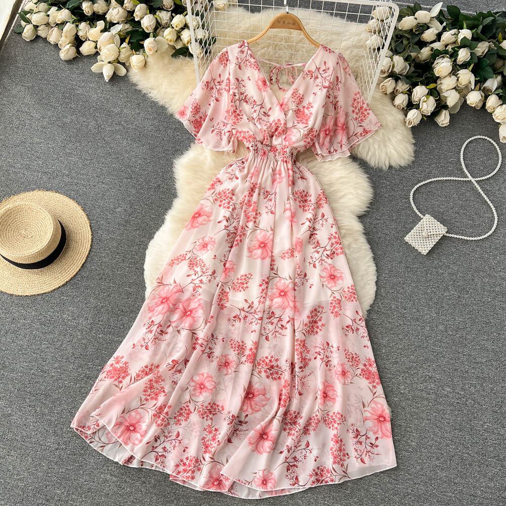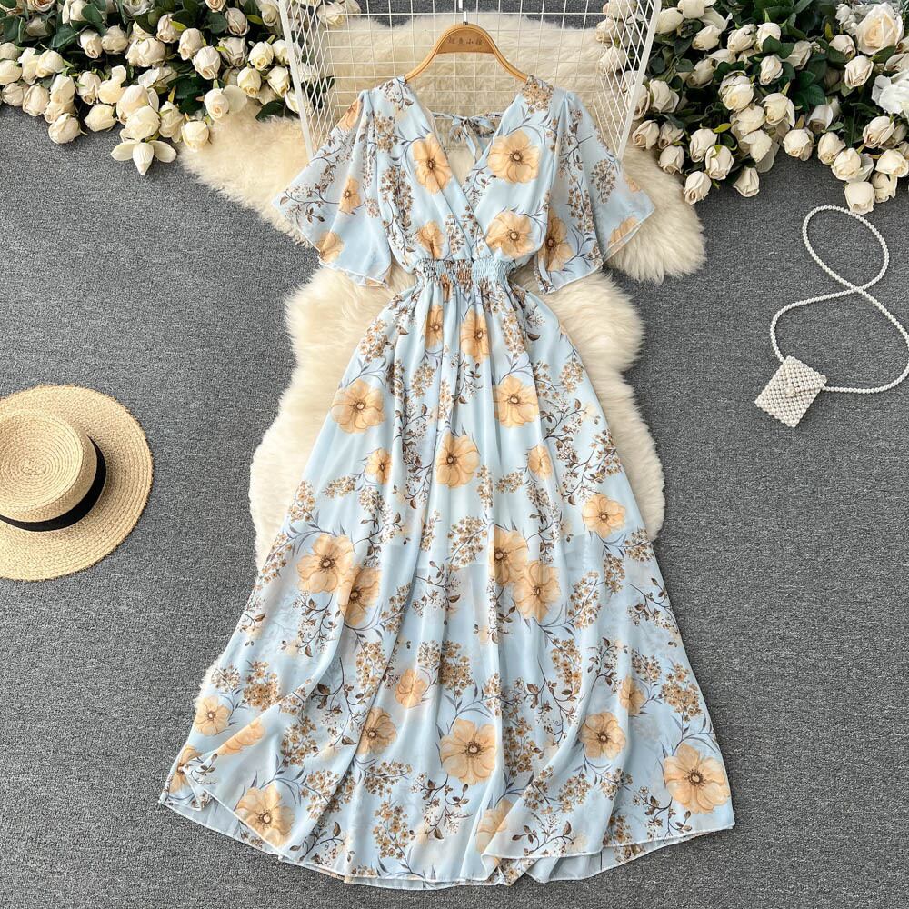 2022 summer new version ins floral niche design retro V-neck dress with waist and big swing long skirt trendy ロング レトロ サマー 夏物 花柄 スカート Vネック lyxaj99578938261