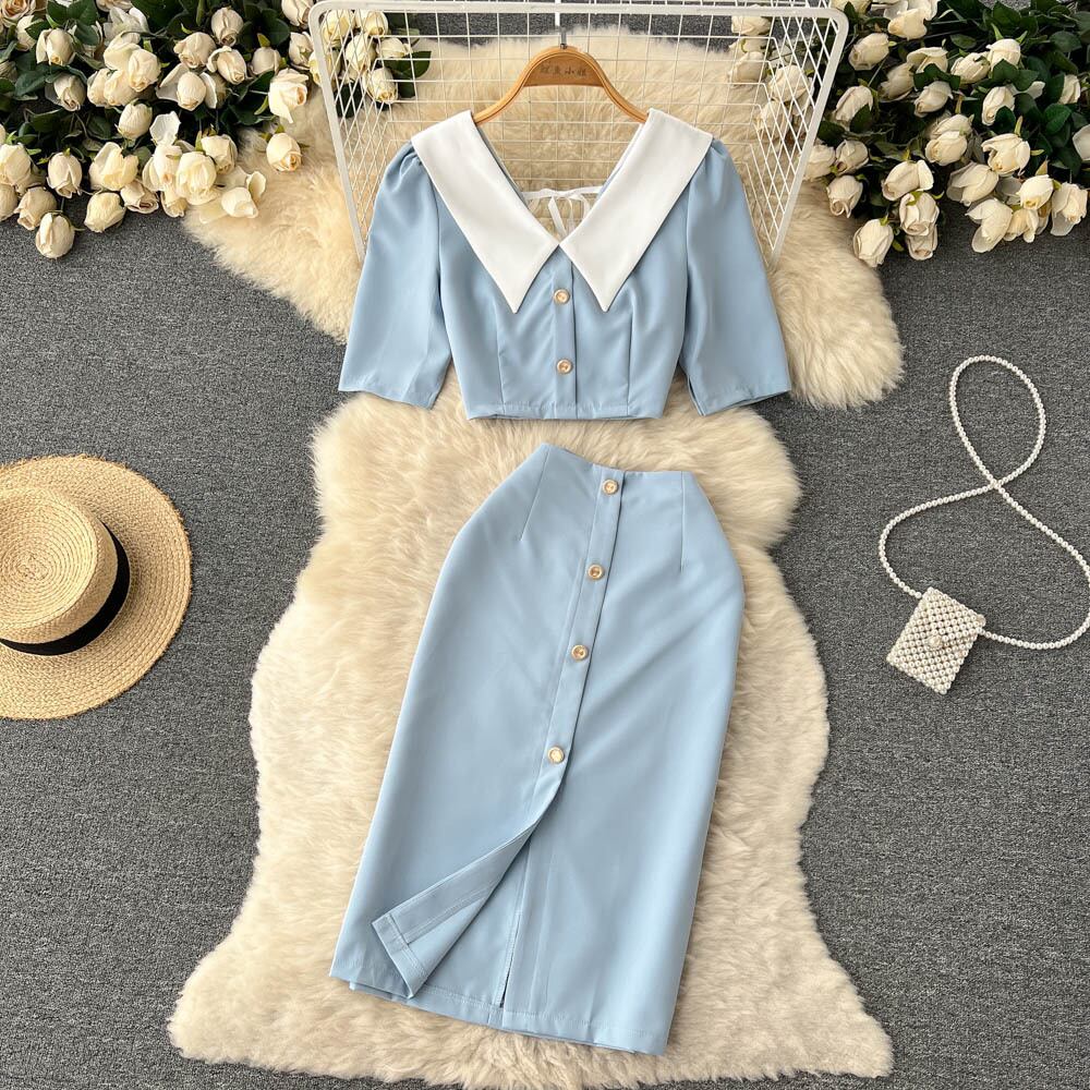 Doll collar shirt women's summer new 2022 sweet age-reducing short top + high waist skirt two-piece suit ハイウェスト ショート 大人ガーリー スウィート キュート カジュアル サマー 夏物 スカート lyxaj47231656084