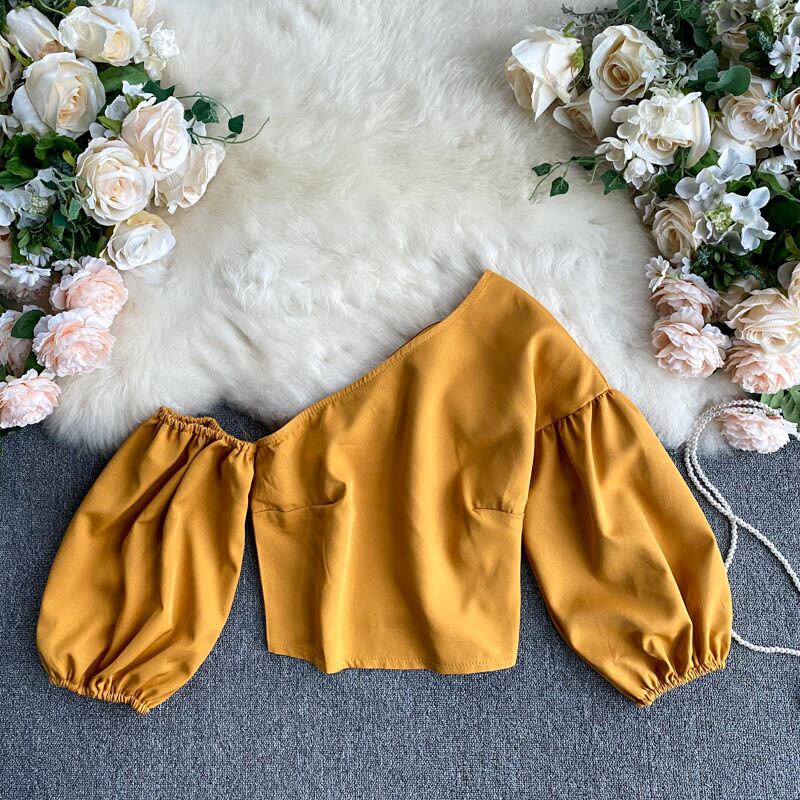 European and American ins design sense oblique collar scheming unilateral off-shoulder puff sleeve short top women's summer dress 2020 new trend ショート サマー 夏物 オフショルダー ヨーロピアン lyxaj7780100607