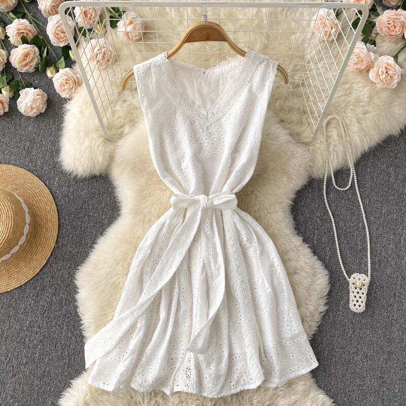 Bellflower skirt women's summer new French retro V-neck temperament ladies waist bandage niche sleeveless dress レトロ サマー 夏物 ノースリーブ スカート Vネック フラワーデザイン lyxaj85987975621