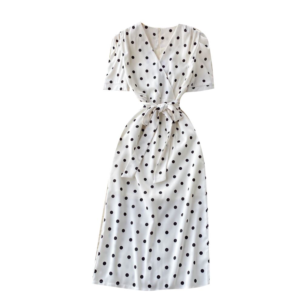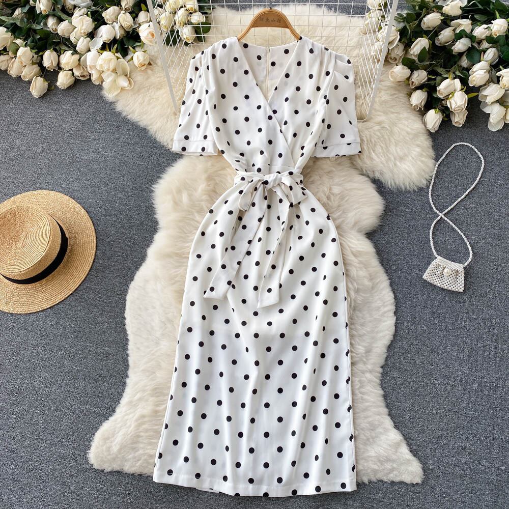and sweet polka dot print dress summer 2022 new lace-up waist puff sleeves hip A-line long skirt ロング レース 大人ガーリー スウィート キュート カジュアル サマー 夏物 スカート Aライン レースアップ lyxaj1190882346