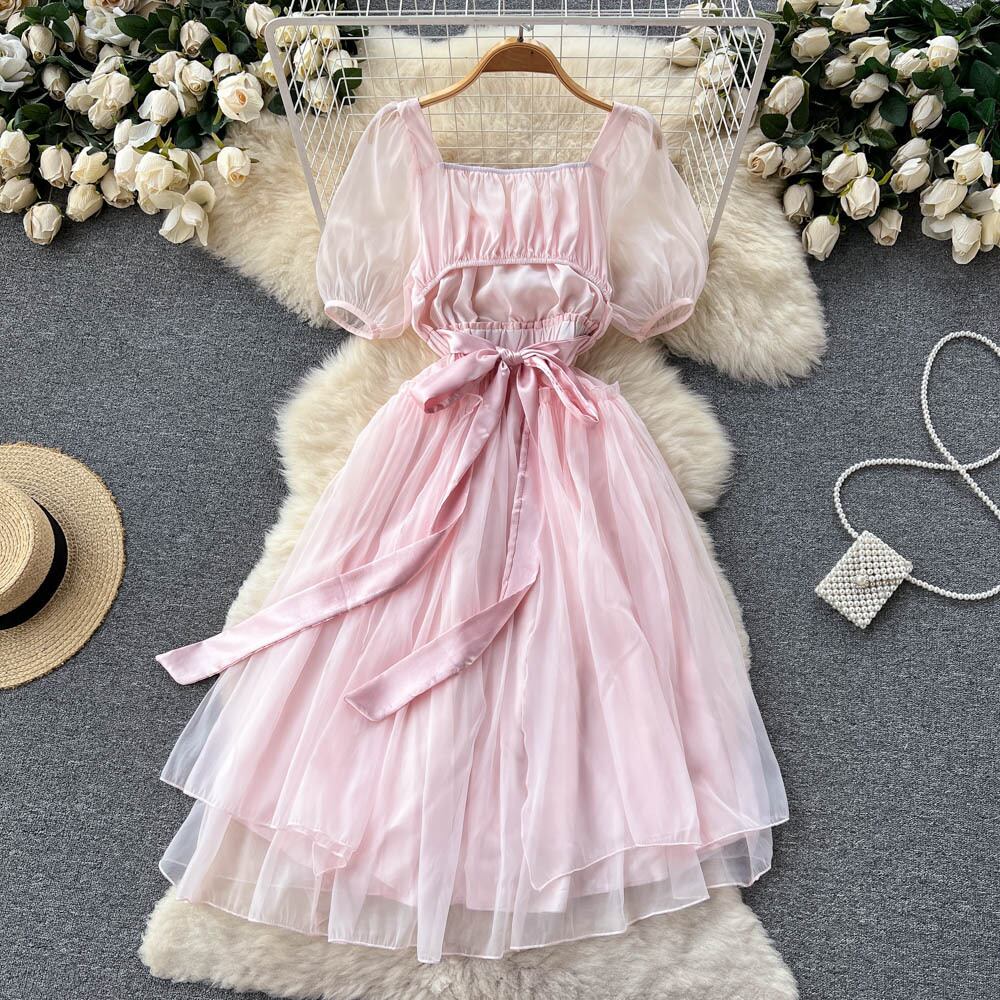 ピンクの年齢を減らすパフスリーブドレス2022夏の新しい韓国版のスーパーフェアリースクエアカラーウエスト気質Aラインスカート サマー 夏物 スクウェア lyxaj9588319926