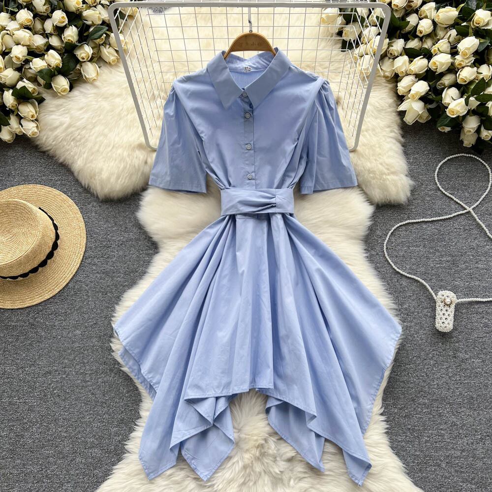Summer new polo collar waist irregular solid color design sense of light familiarity mid-length temperament chic dress サマー 夏物 ソリッドカラー lyxaj7005045794
