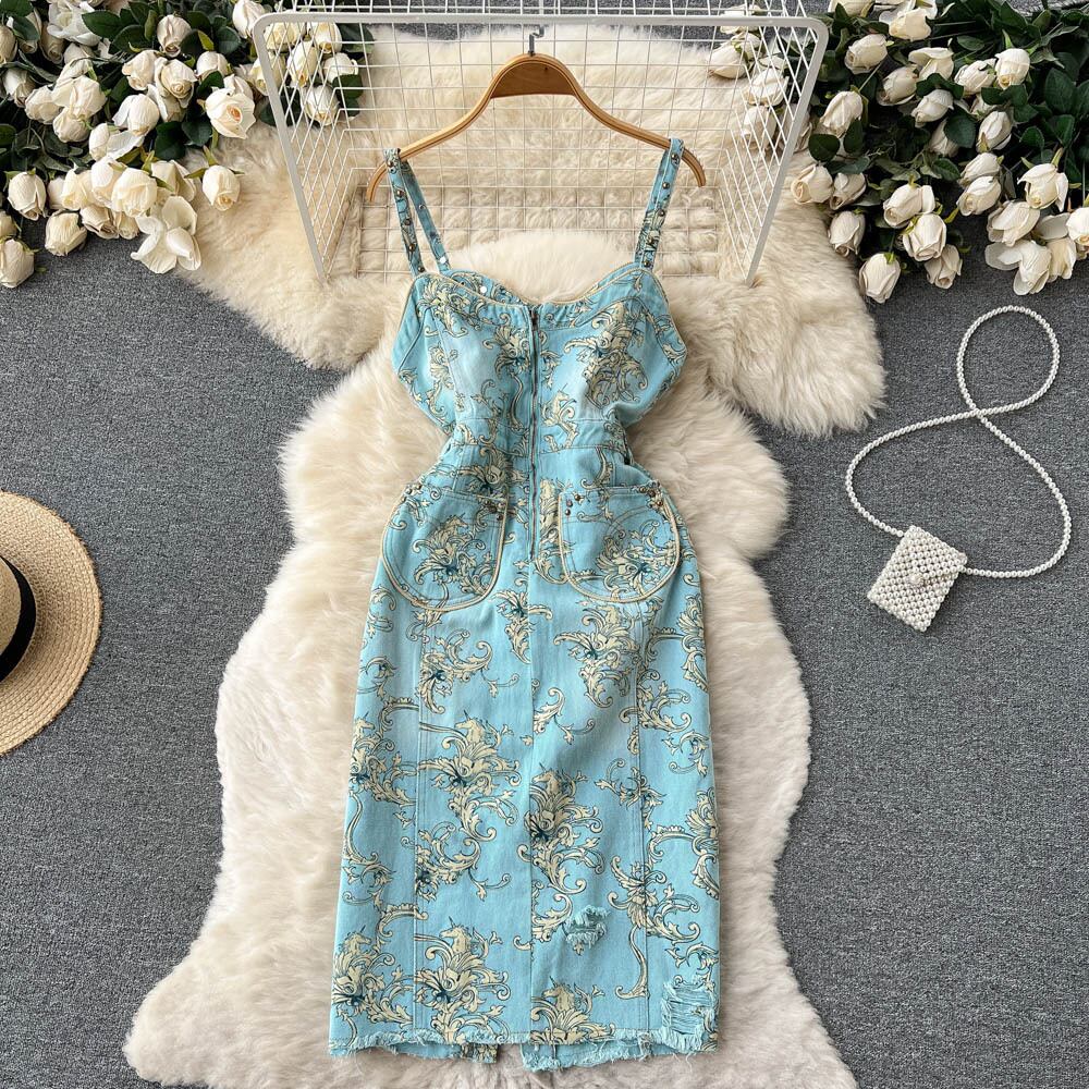Retro chic wind fairy sweet slim slim printed denim dress temperament waist bag hip suspender skirt レトロ プリント 大人ガーリー スウィート キュート カジュアル スカート スリム lyxaj7576862045