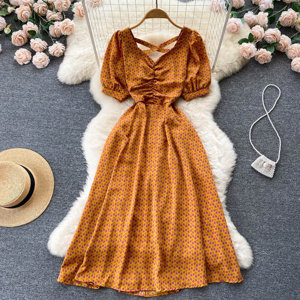フローラルシフォンスカートレディースサマーロータスリーフスカートレディースウエストの韓国版新作ウエストは細く膝上Vネック気質ロングスカート 夏物 花柄 lyxaj55598471876