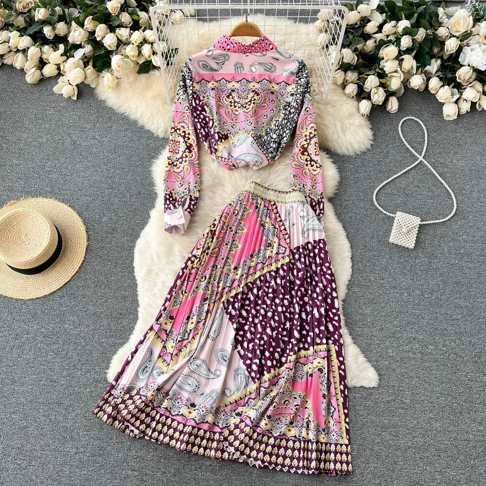 2022 spring and summer new contrast color lapel long-sleeved white shirt high-waist pleated over-the-knee skirt two-piece suit ロング ホワイト プリーツ スプリング 春物 サマー 夏物 スカート lyxaj96907392279