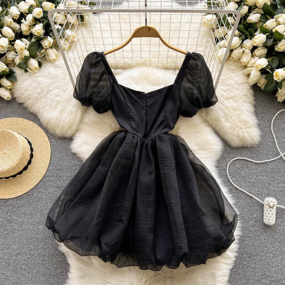 スウィートバブル半袖スモールAラインスカートヘップバーンスタイルスクエアネックウエストシンサマー気質シフォンワンピース ショート ハーフスリーブ 大人ガーリー キュート カジュアル 夏物 スクウェア lyxaj69619719723