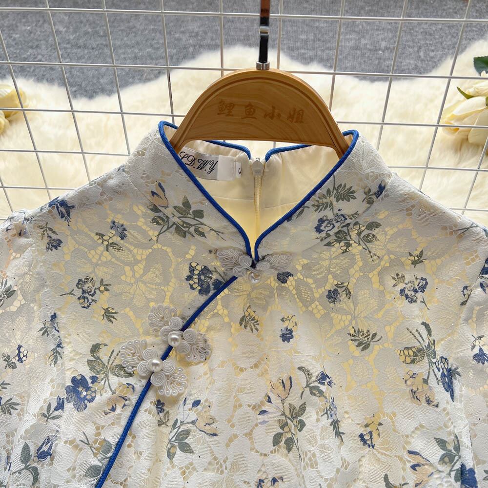Improved Cheongsam Dress Women's Summer Sweet Lace Print Puff Sleeve Slim Short Ruffle Skirt ショート レース 大人ガーリー スウィート キュート カジュアル サマー 夏物 スカート スリム lyxaj77787193684