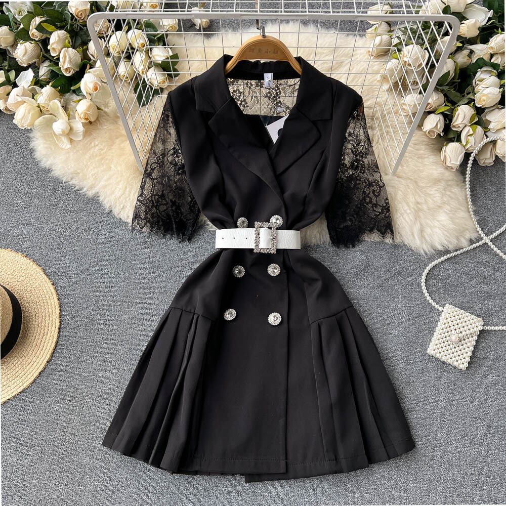 メッシュレースステッチスーツカラー韓国風ニューカジュアルオールマッチダブルブレストレースアップミドル丈プリーツワンピース lyxaj74552620468